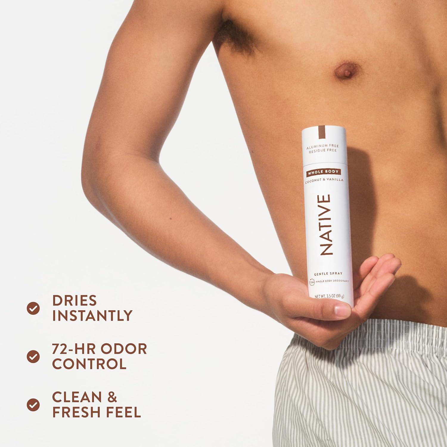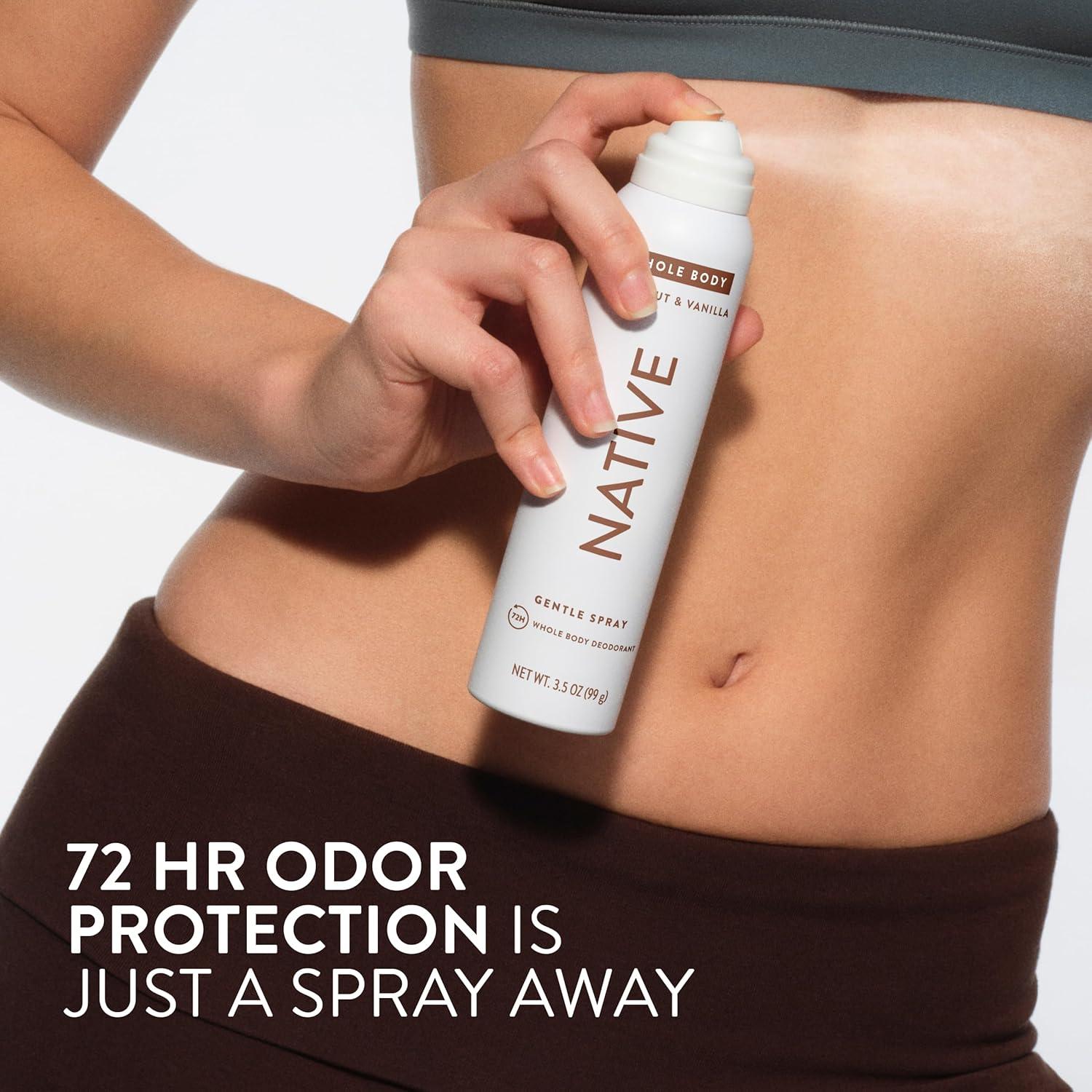 Everything you love about Native Deodorant, now in a light-as-air spray. Native Deodorant Spray for men and women delivers effective odor protection for up to 72 hours. It also doubles as an all-over fragrance spray. Powered by an ozone-friendly natural propellant, this deodorant sprays easily on your underarms and chest for a fragrant pick-me-up. Free of aluminum salts, baking soda, parabens, and talc, Native Deodorant Spray is thoughtfully made with 6 clean ingredients, including plant-based skin conditioners and odor neutralizers. Native Deodorant Spray is also free of hydrocarbon propellants, using the power of nitrogen to release a cool, scented mist that dries on contact. All of the ingredients in this clean deodorant spray work together to keep you smelling (and feeling) fresh. Native: Clean. Simple. Effective. Like all Native products, this stink-fighting deodorant spray provides a delightful personal care experience that really works. Complete your self-care routine with Native's full range of products including hair care, body wash, and moisturizing lotion.