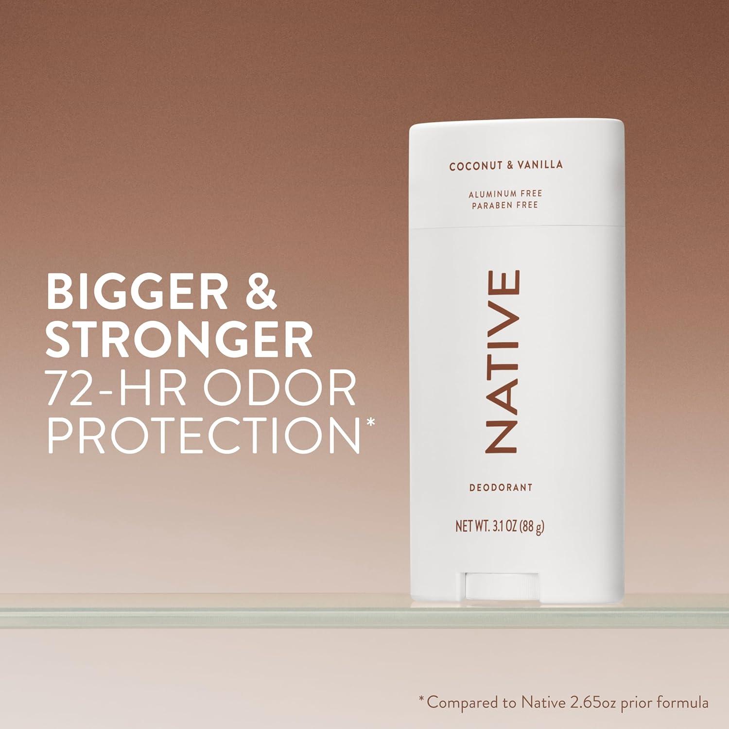 “A couple swipes of this naturally derived Native Deodorant go a long way, delivering effective odor protection for up to 72 hours. Free of aluminum salts, parabens, and phthalates, this deodorant stick is thoughtfully made with less than 10 clean ingredients to fight unpleasant underarm smells, so you never have to worry. Native Deodorant includes baking soda to neutralize odors and shea butter for a smooth application. All of the ingredients work together to keep you smelling (and feeling) fresh. This clean deodorant isn't greasy or sticky, and feels dry when applying. Formulated for men and women, this award-winning formula is strong enough to work on anyone's pits, period. Native: Clean. Simple. Effective. Like all Native products, this deodorant stick provides a delightful personal care experience that really works. Complete your self-care routine with Native's full range of products including hair care, body wash, and moisturizing lotion.”