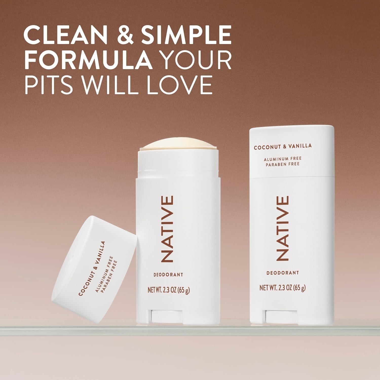 A couple swipes of this naturally derived Native Deodorant go a long way, delivering effective odor protection for up to 72 hours. Free of aluminum salts, parabens, and phthalates, this deodorant stick is thoughtfully made with less than 10 clean ingredients to fight unpleasant underarm smells, so you never have to worry. Native Deodorant includes baking soda to neutralize odors and shea butter for a smooth application. All of the ingredients work together to keep you smelling (and feeling) fresh. This clean deodorant isn't greasy or sticky, and feels dry when applying. Formulated for men and women, this award-winning formula is strong enough to work on anyone's pits, period. Native: Clean. Simple. Effective. Like all Native products, this deodorant stick provides a delightful personal care experience that really works. Complete your self-care routine with Native's full range of products including hair care, body wash, and moisturizing lotion. We know how much you love our deodorant, so we decided to bring you a twin pack for 2x the clean odor protection (and amazing scent, obviously)!